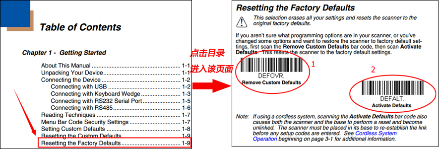 一般恢復(fù)出廠設(shè)置的介紹在第一章節(jié),如上圖,我們在目錄中就可以很明顯的找到【Resetting the Factory Defaults】,點(diǎn)擊進(jìn)入該頁面,依次掃描這兩個條碼即可。